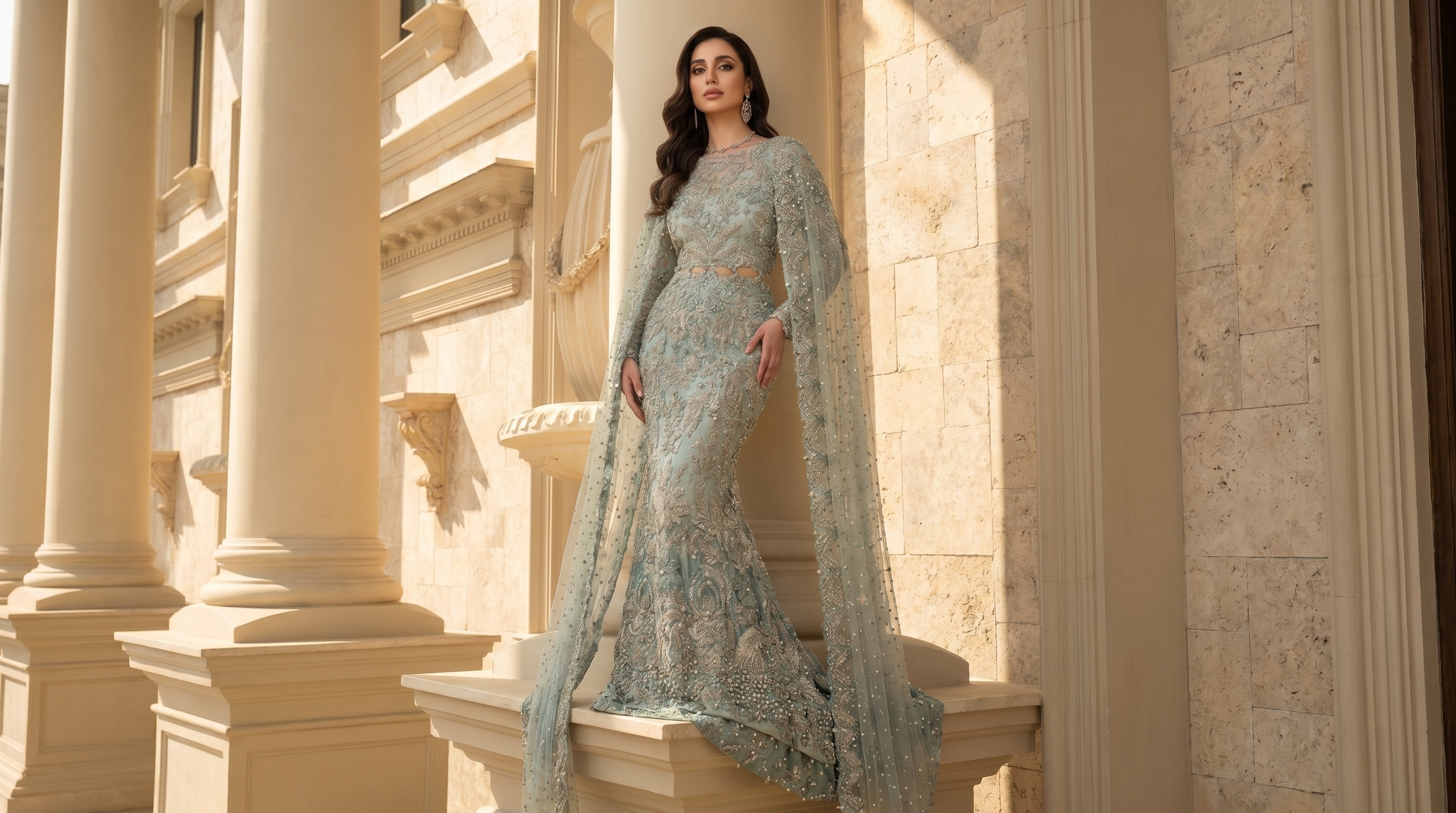 The most popular Pakistani Eid outfits for 2026 are lehengas, anarkali suits, sharara sets, gharara suits and embroidered festive ensembles. Trending colours include sage green, dusty lilac, champagne gold, blush pink and jewel tones like emerald and sapphire. At Aish, all pieces feature hand-applied zardozi, resham and sequin embroidery on premium chiffon, organza and velvet fabrics.