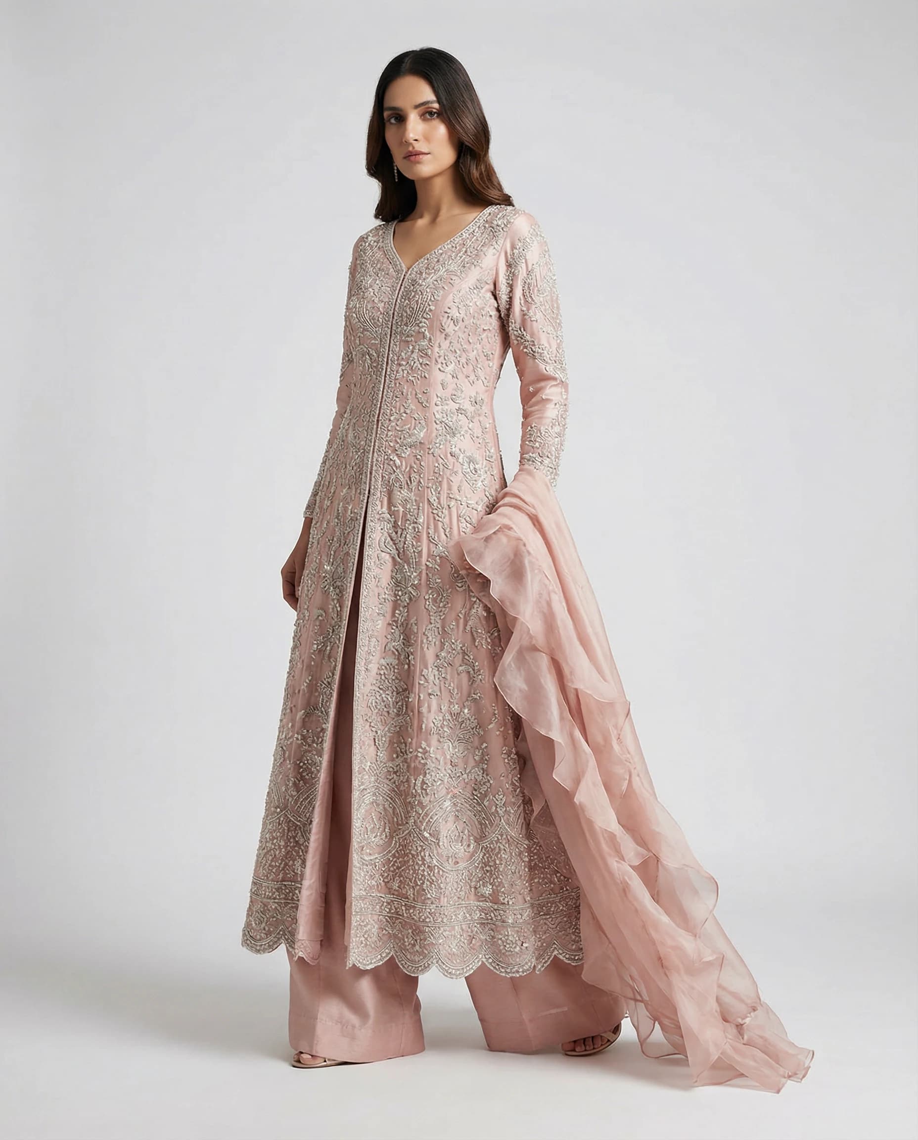 Floor-length open gown in blush pink with heavy silver and white embroidery, beadwork and sequins. V-neck, embroidered sleeves and scalloped hem. Matching wide trousers and sheer ruffled dupatta with pearl trim and soft floral accents.