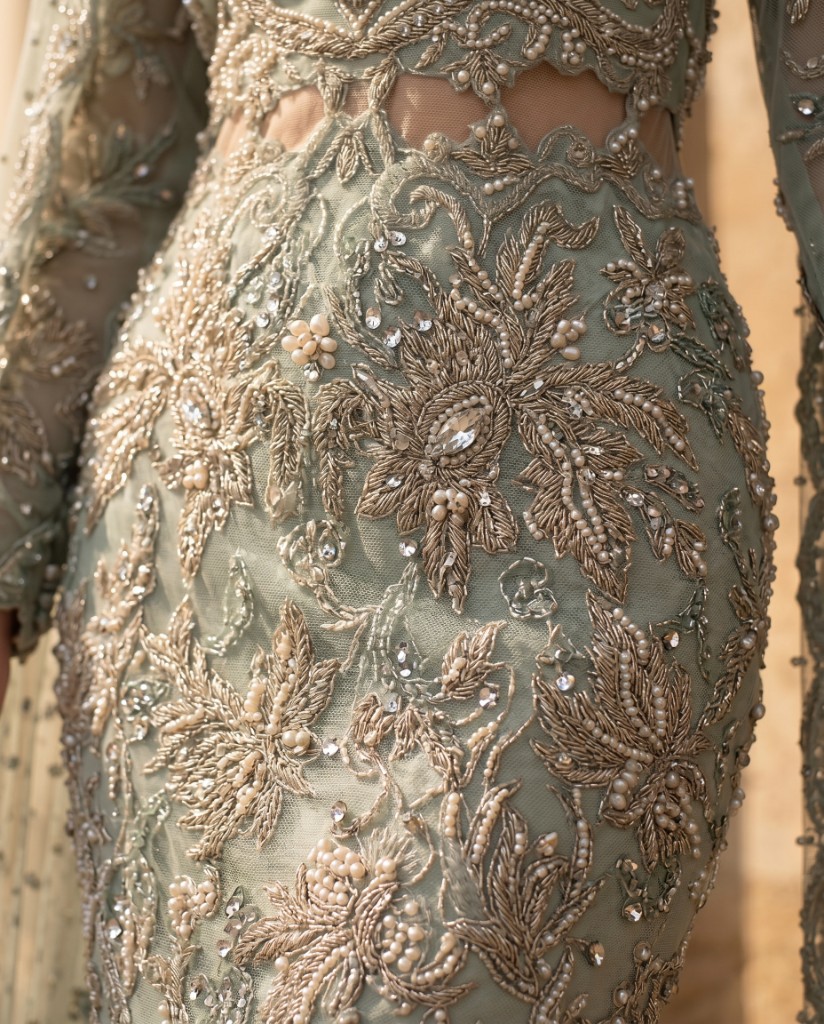 A show-stopping pale mint couture gown with pearl and silver embellishment, sculpted botanical motifs and a statement mermaid silhouette. Cape-style sheer sleeves and a full-length train are finished with hand-applied beadwork and sequins for a luxury editorial look.