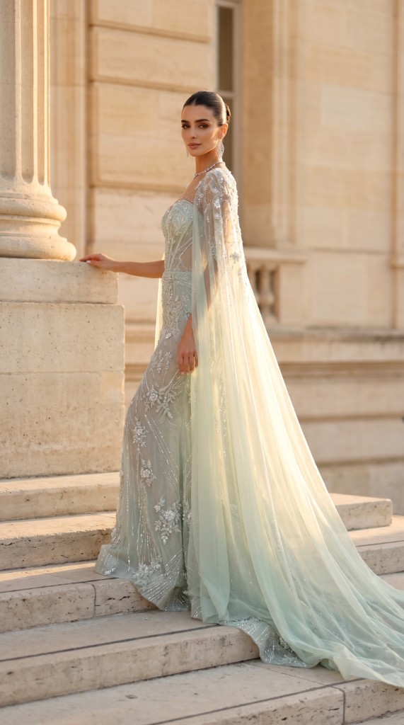 A pale sage mint couture gown with hand-finished silver and white floral embroidery, pearl and sequin highlights, and a dramatic sheer floor-length cape at the shoulders. The mermaid silhouette and illusion neckline are designed for receptions, black-tie evenings and statement occasion dressing.