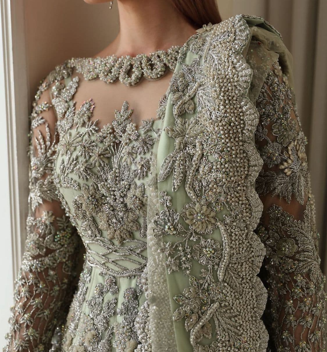 Custom made soft elegance meets timeless luxury in this intricately embroidered sage green anarkali. The silhouette is refined and regal, with a fitted bodice, sweeping skirt and sheer embroidered sleeves designed to move with quiet drama.