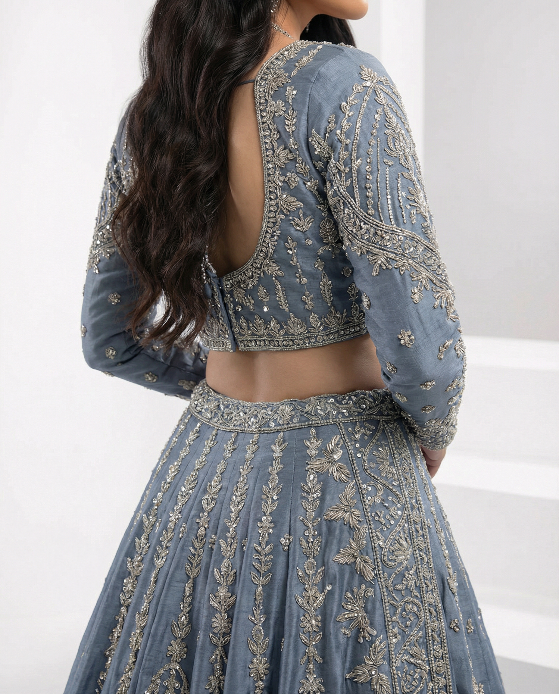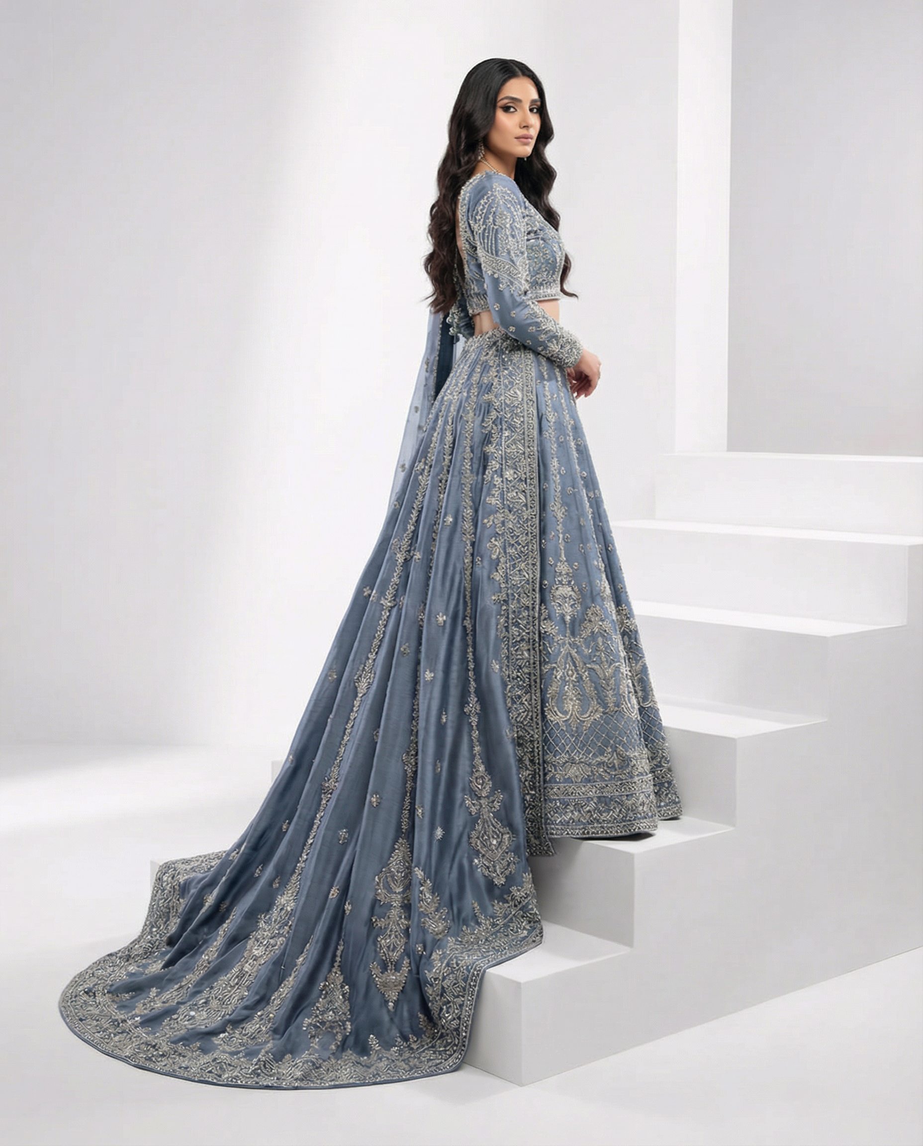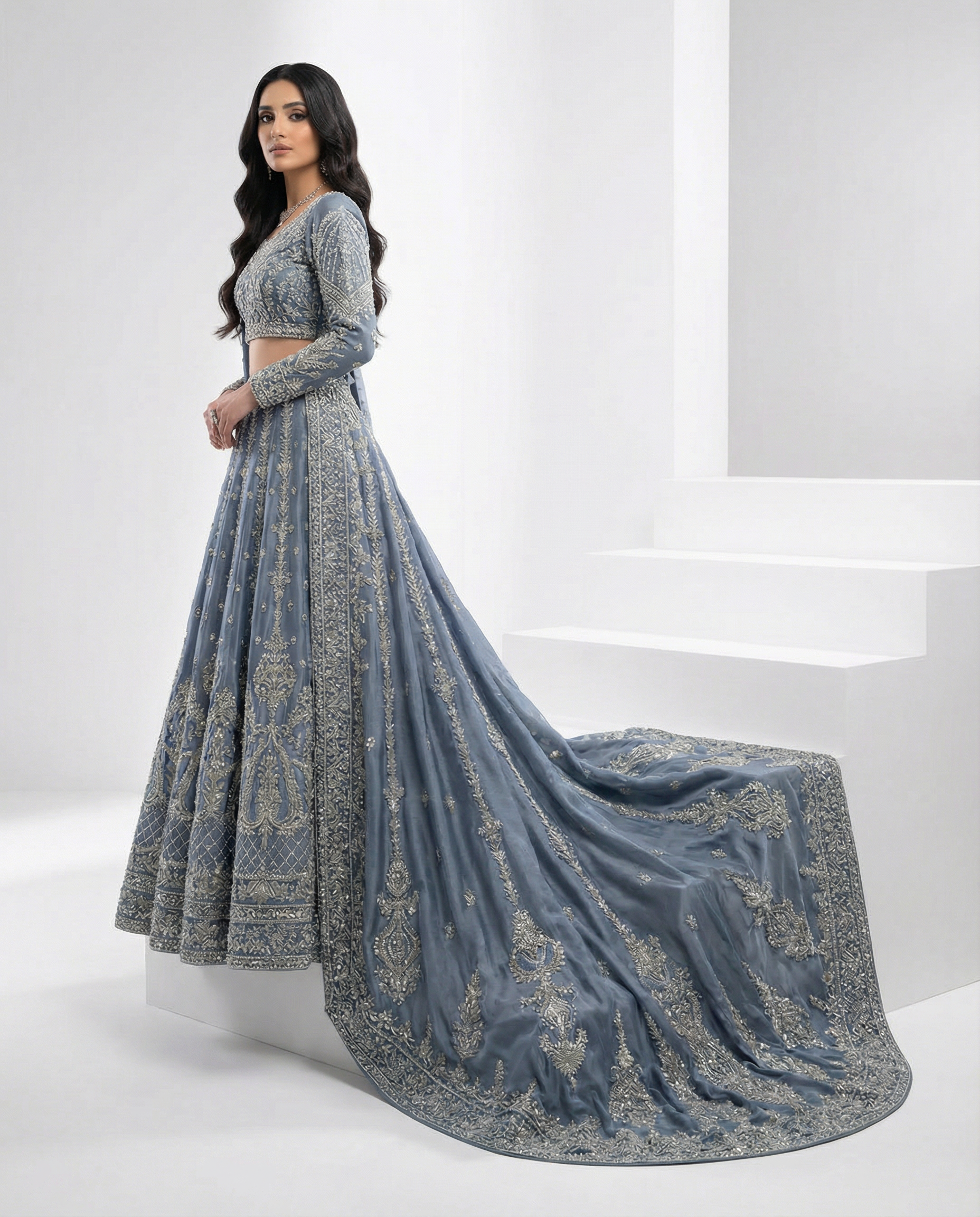 High-end slate blue lehenga with dense silver embroidery and beadwork, styled with a sleeveless choli and long, flowing train. Shot on clean white steps for a luxury campaign feel.