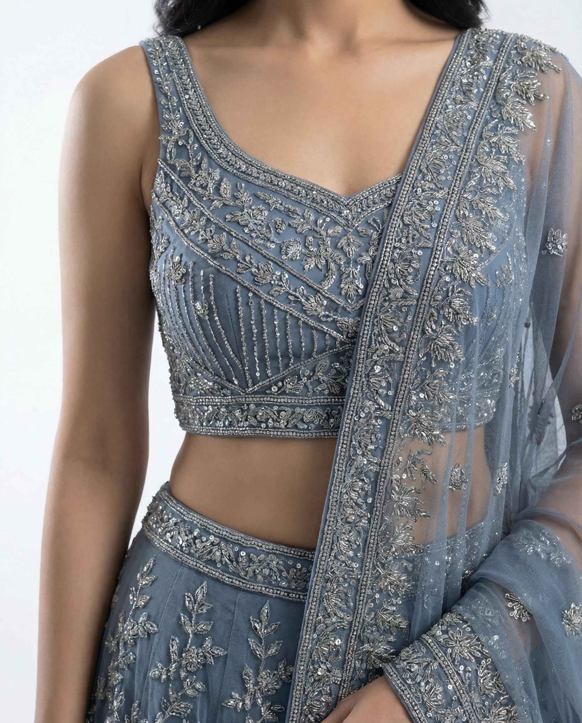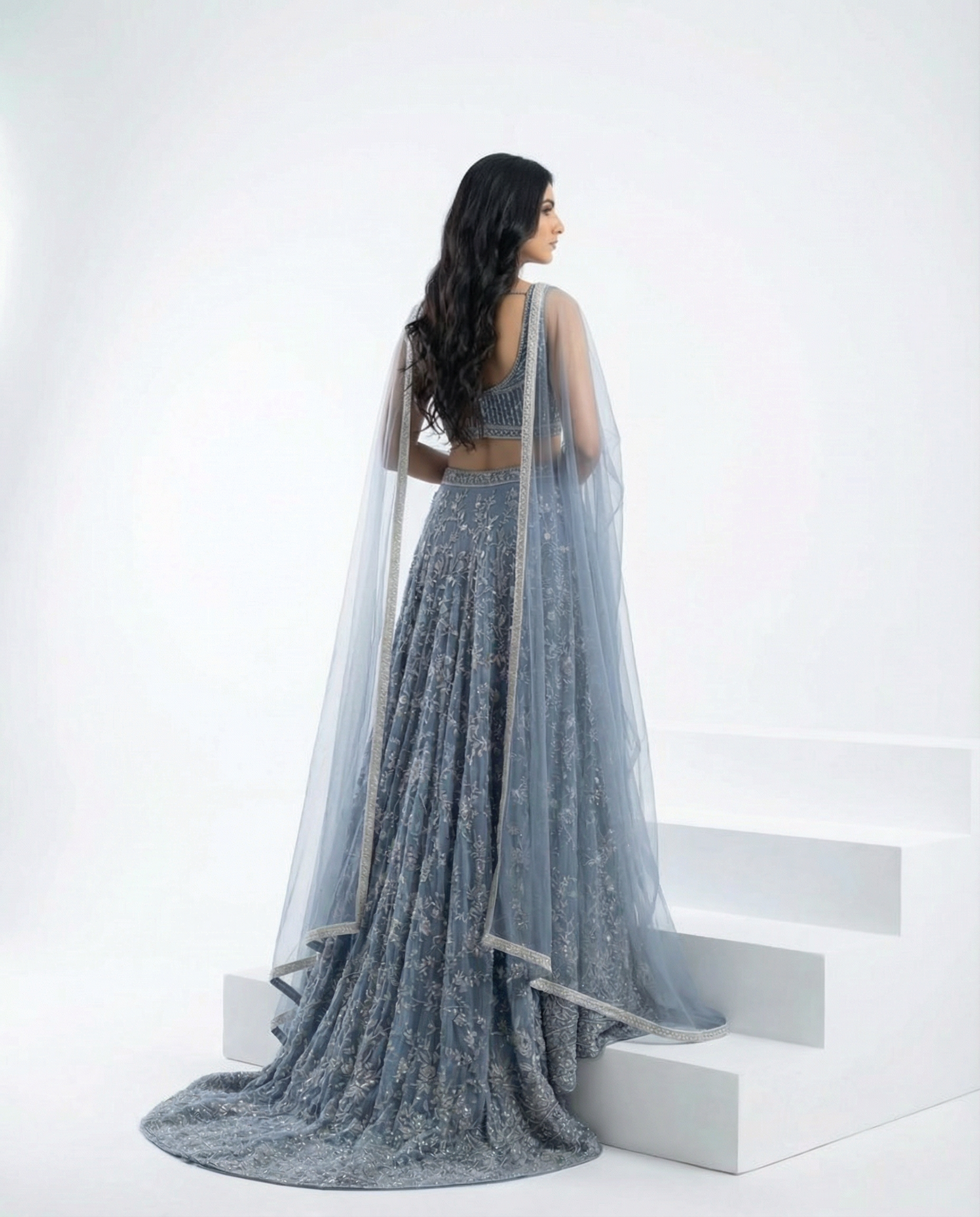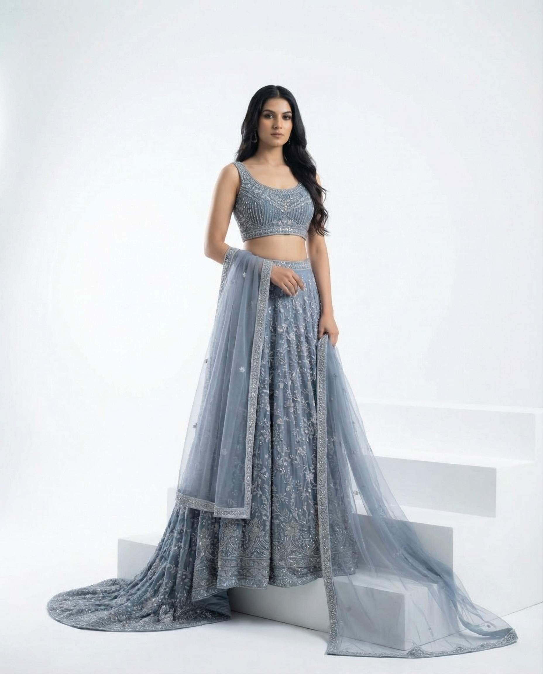 Slim-cut slate blue lehenga with all-over silver embroidery, paired with a sleeveless choli and a sheer net dupatta with a delicate silver border. Styled on white steps for a clean, modern campaign look.